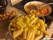 Na makaron rozkładamy usmażone mięsko a na samą górę dajemy warzywa i posypujemy tartym serem.